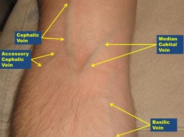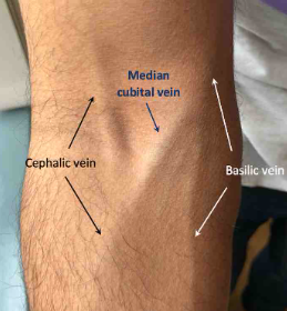 Median cubital vein: Medial aspect of arm, going diagonally upwards