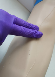 Pull skin below insertion site taut with thumb in opposite direction to needle insertion