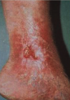 No difference in ulcer healing with GSV stripping vs. compression stockings. Lower recurrence with stripping.