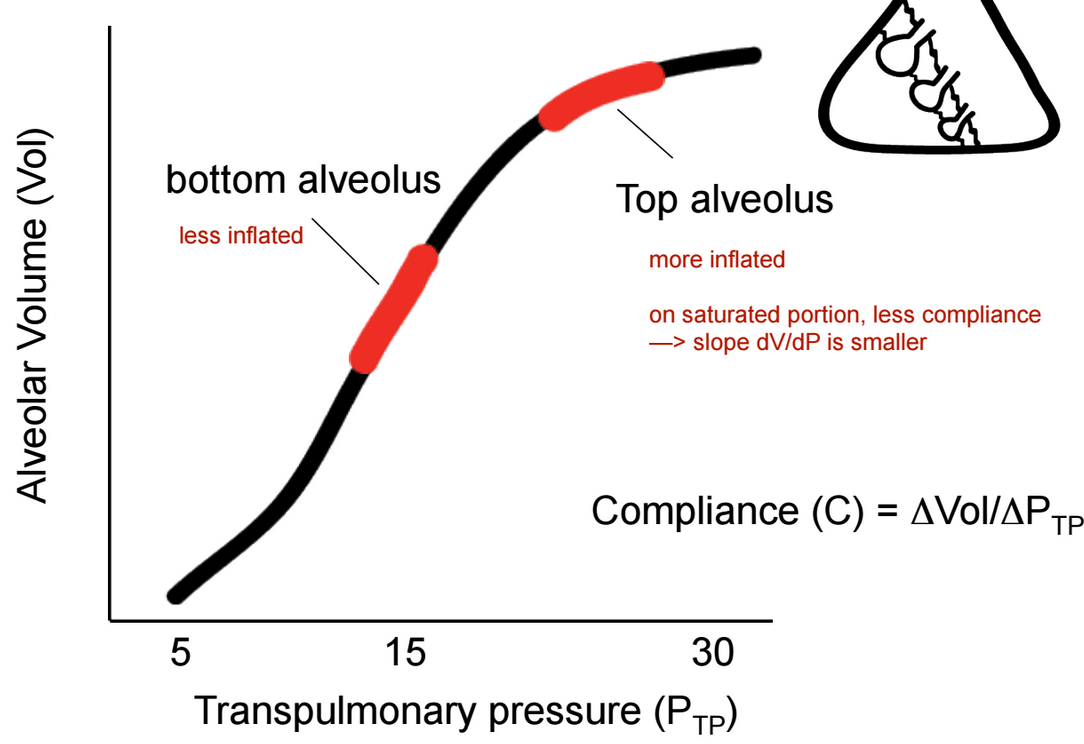 smaller volume = greater possible change in volume = greater air flow and greater ventilation therefore, top alveolus LESS COMPLIANT than bottom because more gravity to incr baseline volume