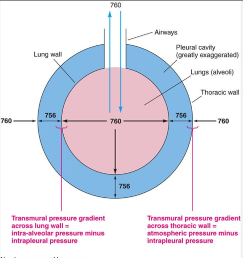 Transmural pressure gradient across the lung wall = intra-alveolar pressure minus intrapleural pressure.