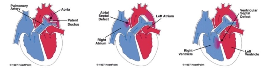 3. Ventricular septal defect: septum between ventricles not completely closed so blood flows from the higher-pressure L heart into lower pressure R heart.