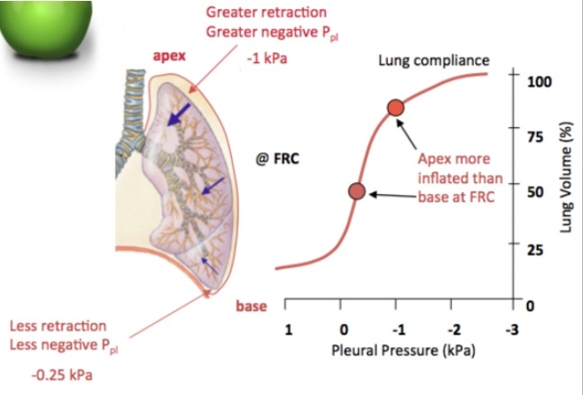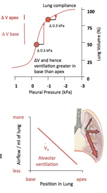 Apex of lung is e.g. 20 cm above tricuspid valve - pressure ↓ by 20 cmH2O (no pulmonary artery pressure)