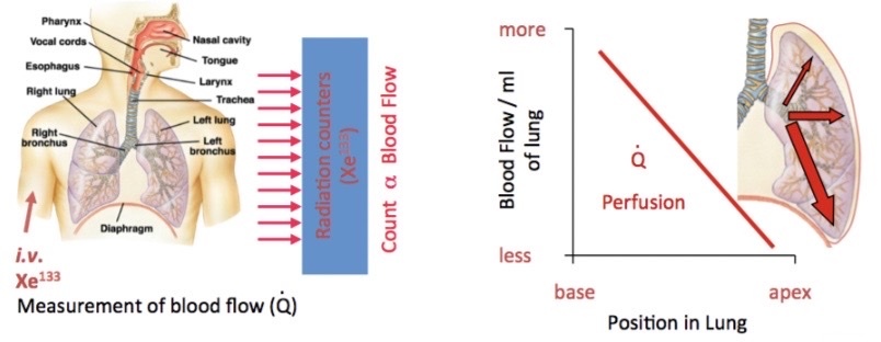 We can measure the distribution of perfusion through lung using radioactive tracer (e.g. Xe133)