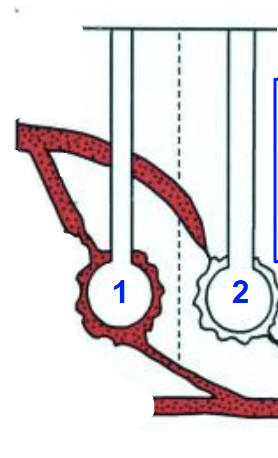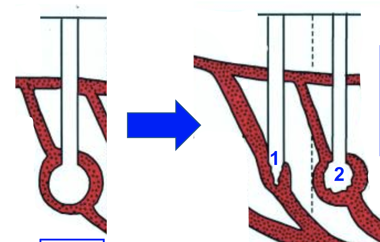 In case 1, there is a severe collapse of the alveolus, leading to severely decreased gas exchange and thus decreased ventilation despite normal perfusion.