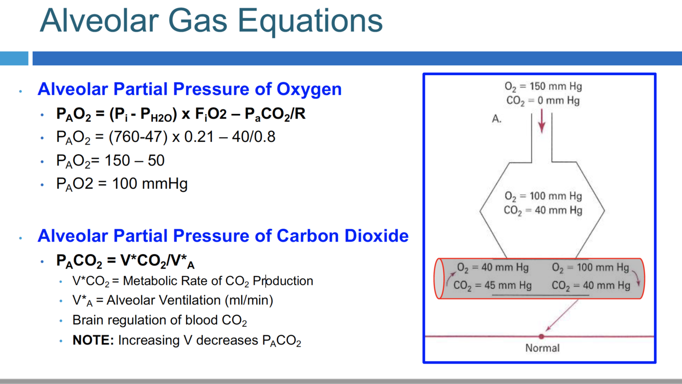 There is obstruction of one of the alveoli so there is no ventilation occuring in the blood that would normally come in contact with that alveolus. Instead, other alveoli that share its airway increase their amount of ventilation to compensate. In this case, since there are just 2 alveoli, the other alveolus doubles its ventilation. Doubling its ventilation would lead to a decreased PACO2 because as V goes up PACO2 goes down. Because the PACO2 has changed, the PAO2 will also change and can be calculated using the alveolar gas eqn.