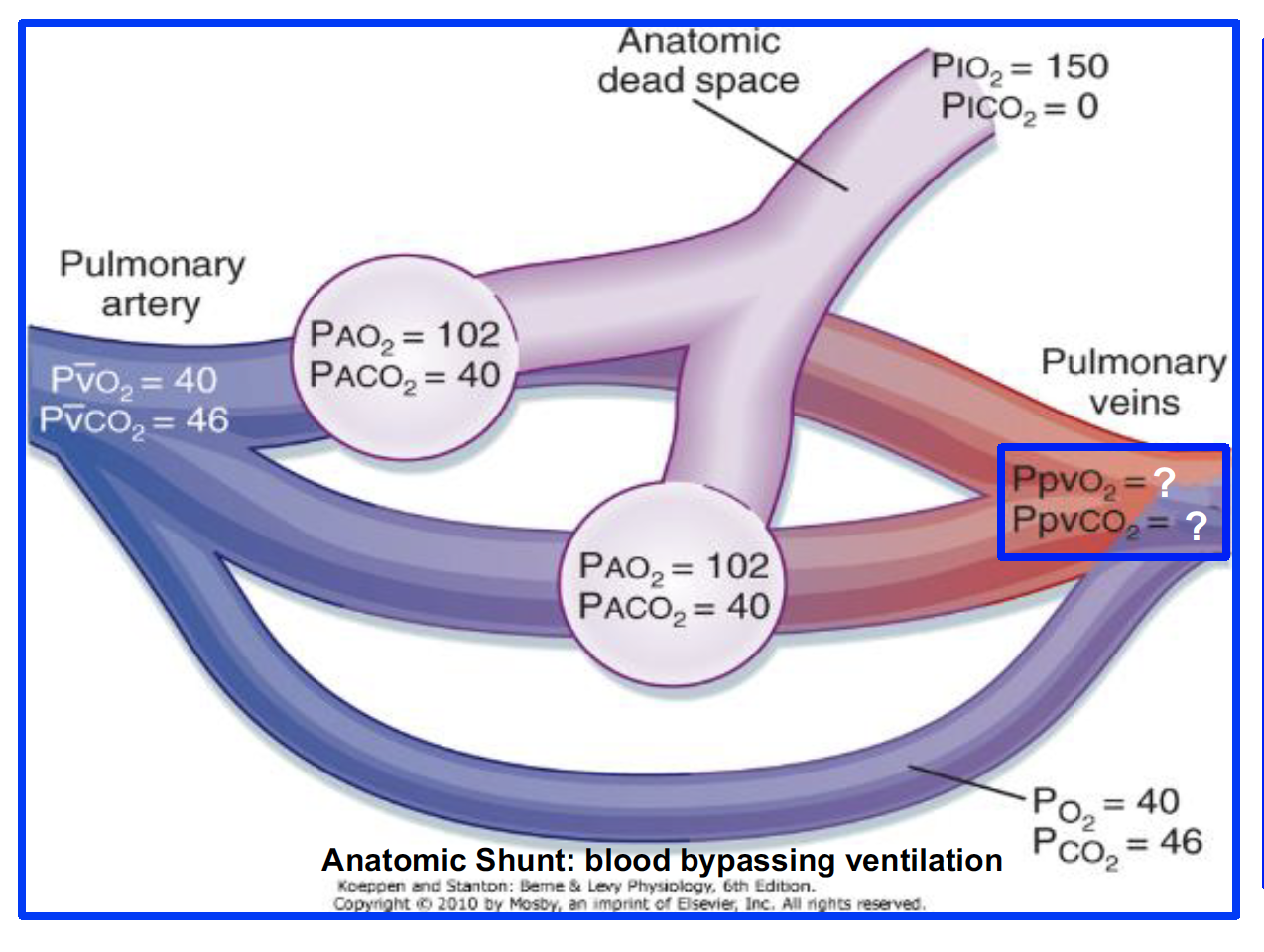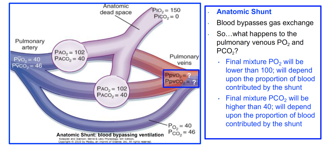 Shunts are places where there is decreased ventilation. An anatomical shunt is a place where there was never supposed to be any gas exchange so the blood supply has no contact with structures that participate in gas exchange so ventilation is 0.