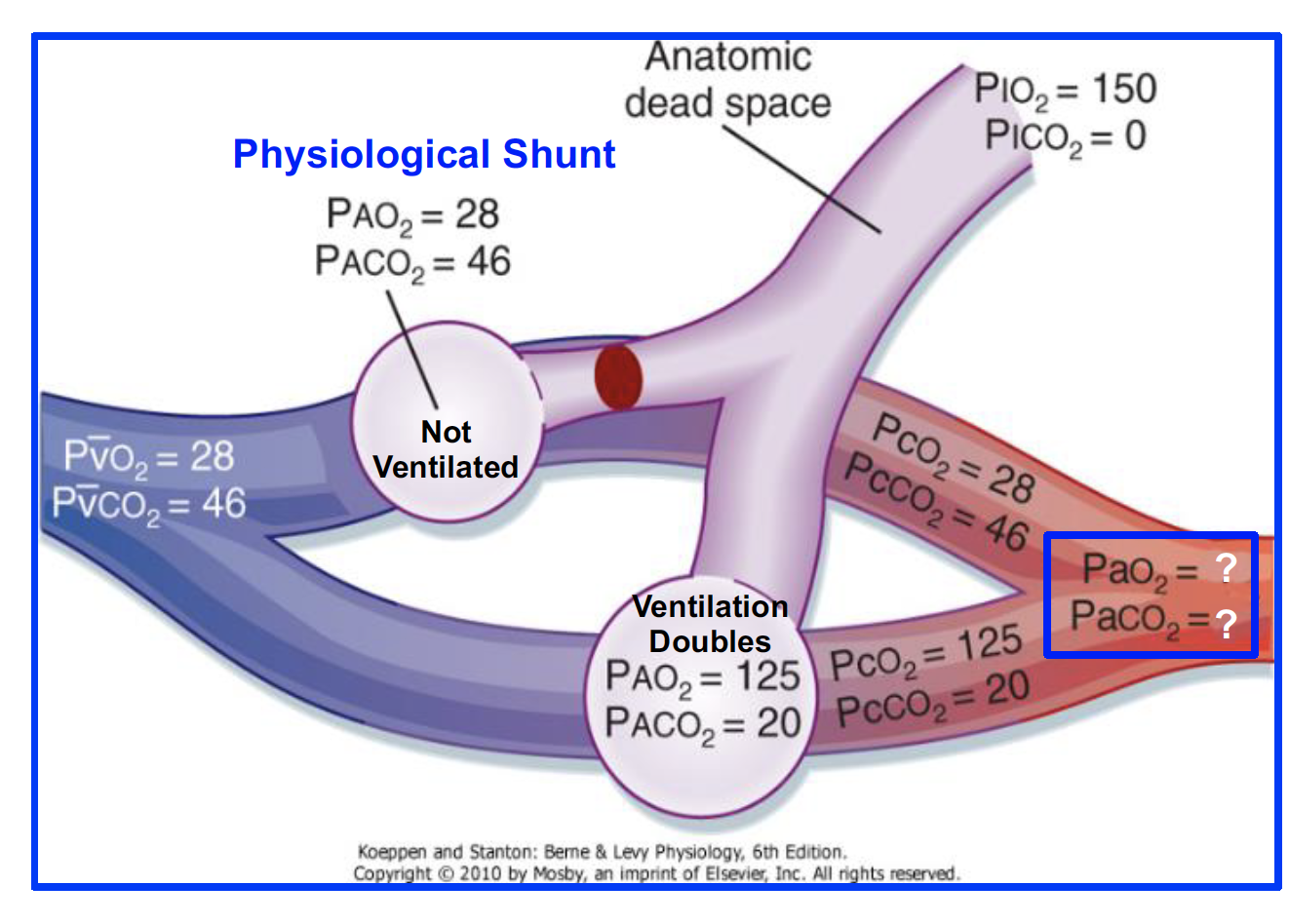 This image shows an example of an anatomical shunt. What will be the final PaO2 and PaCO2?