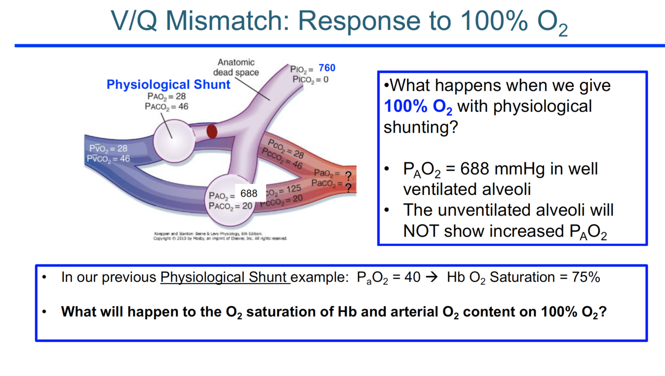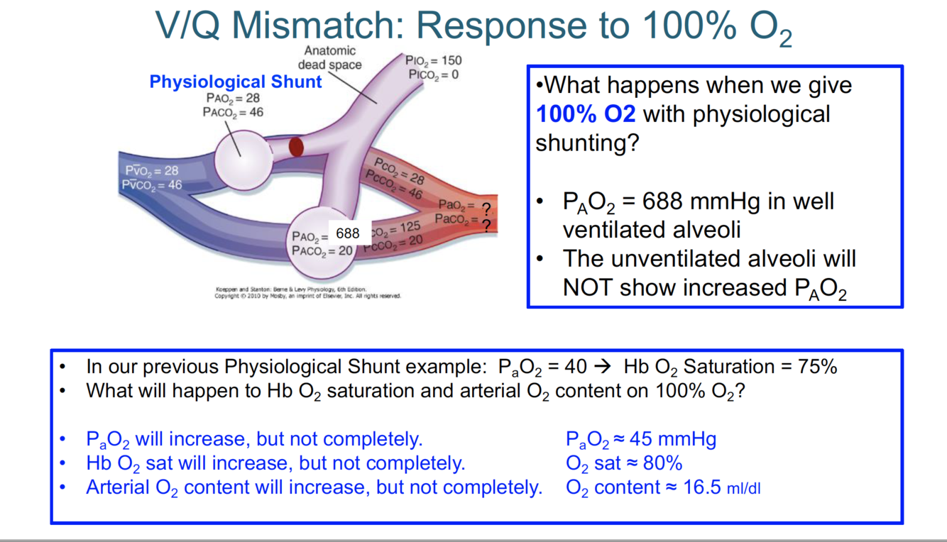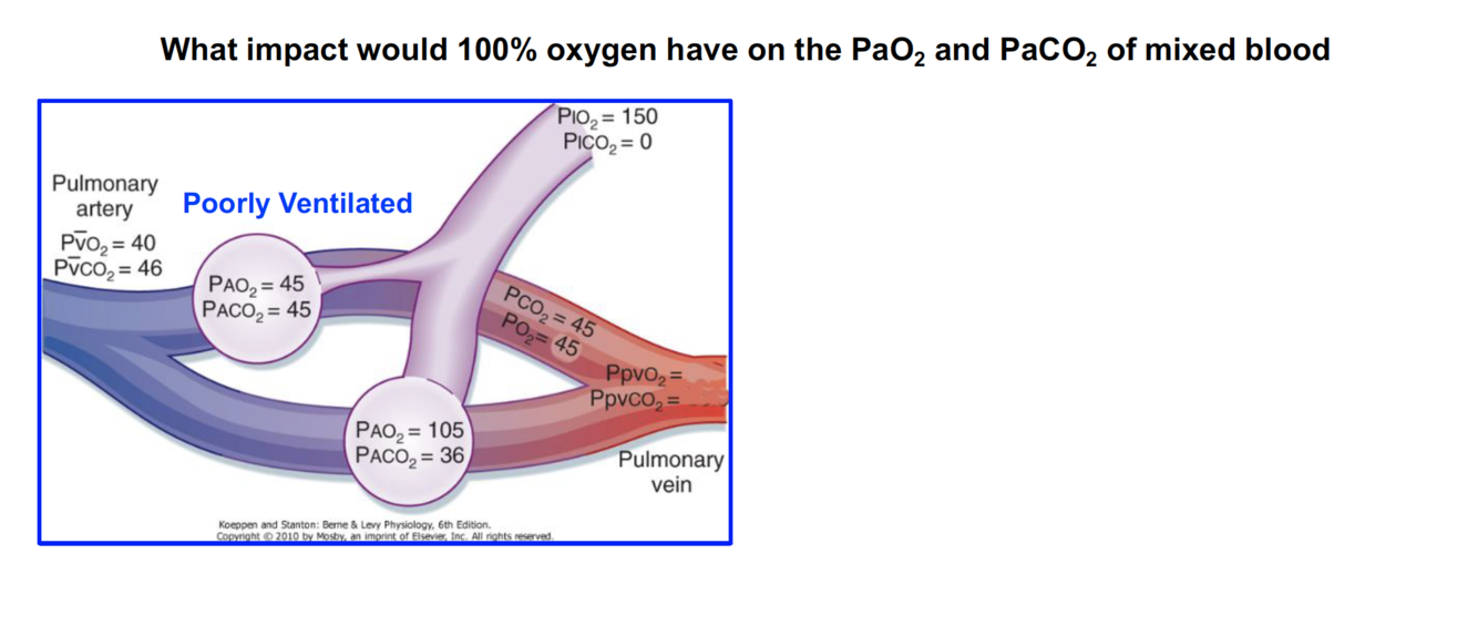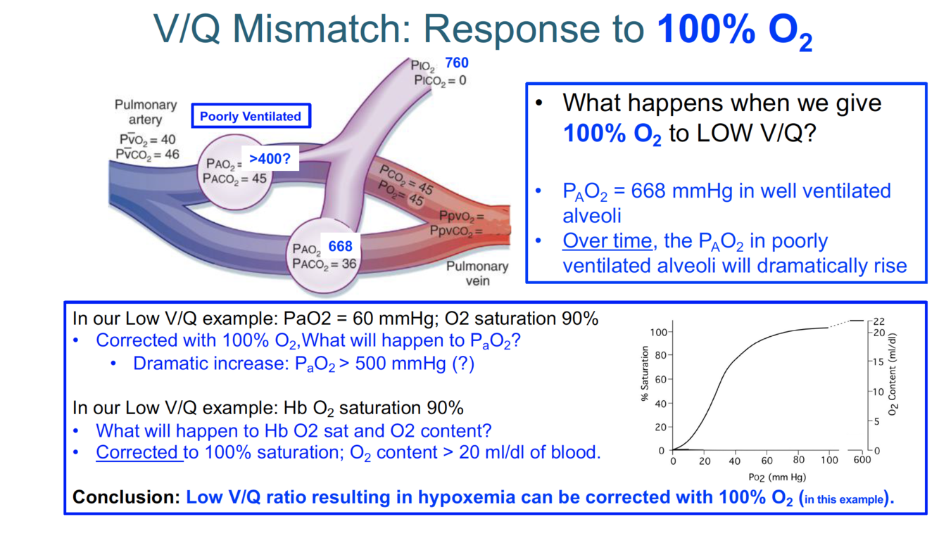 Because there is only poor ventilation, it can be corrected by giving 100% oxygen because given enough time the PAO2 in the poorly ventilated alveoli will increase and be able to exchange more O2. Additionally, the healthy alveoli can make up some of the difference also.