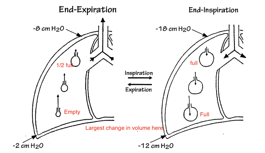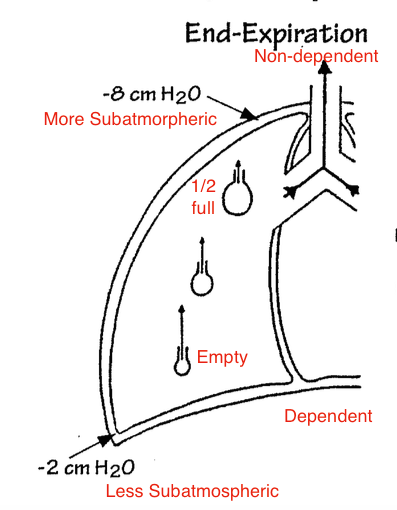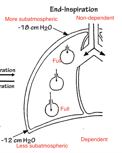during END-expiration. what area of the lung is more subatmospheric and what area is less subatmospheric