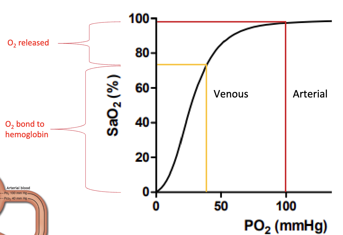 Arterial blood (PO₂ ~100 mmHg) → ~98–100% saturated