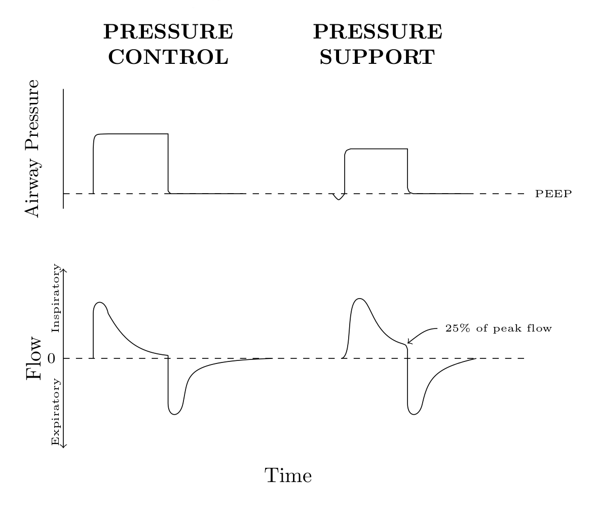 Pressure control As the lung expands, compliance decreases. As a result flow decelerates during the respiratory cycle –> variable tidal volumes whenever resistance changes (inflating/deflating abdomen during laparoscopic surgery)