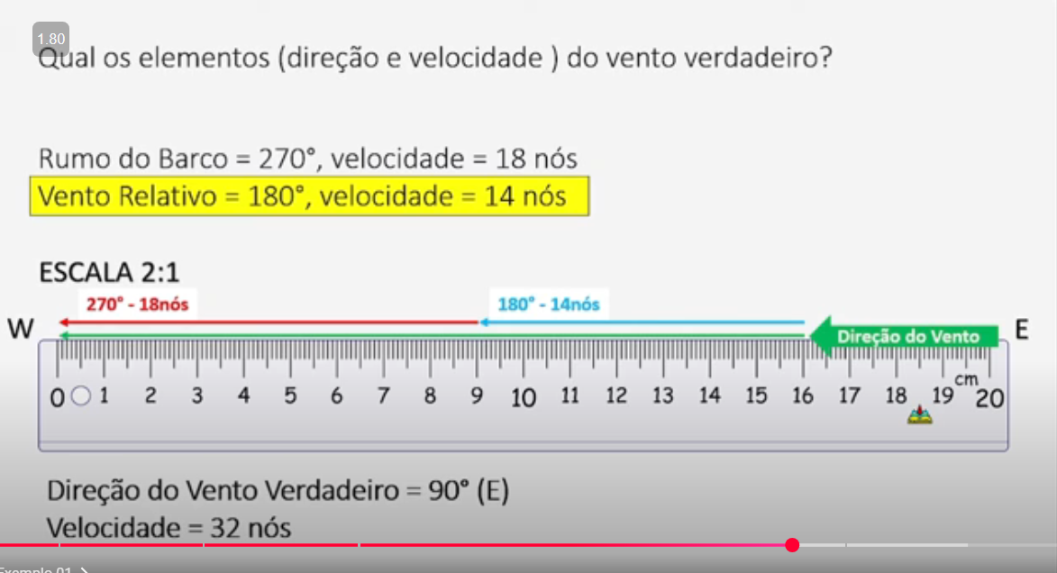 Qual a direção e a velocidade do vento verdadeiro de um barco com as seguintes características: