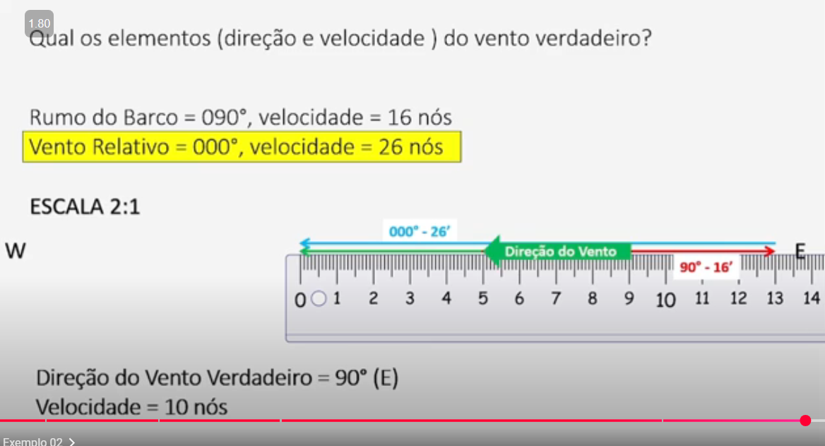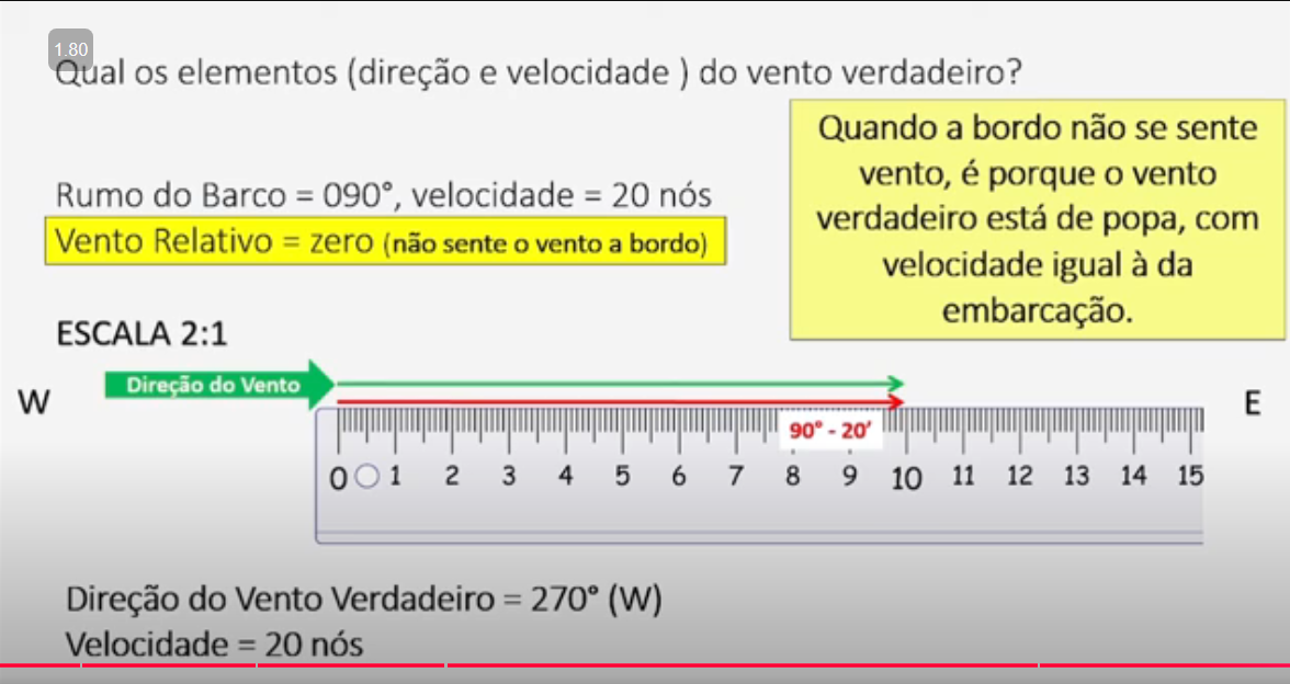1) Neste caso, o vento verdadeiro será obtido subtraindo ou somando ao vento relativo a velocidade da embarcação. Esse tipo de situação ocorre, justamente, quando o vento relativo está entrando pela proa (000° relativos) ou pela popa da embarcação (180° relativos).