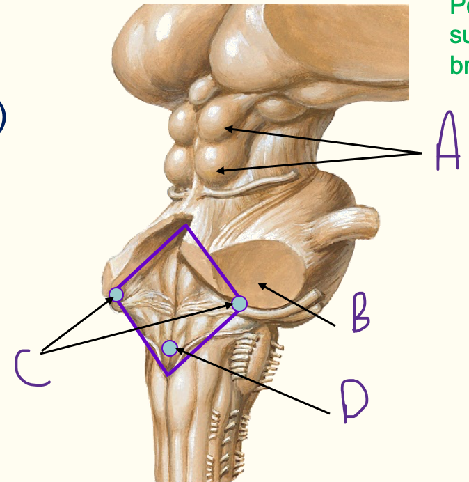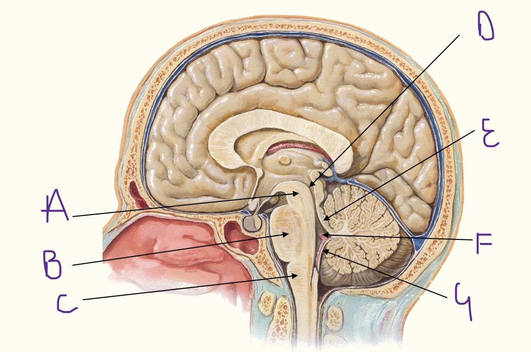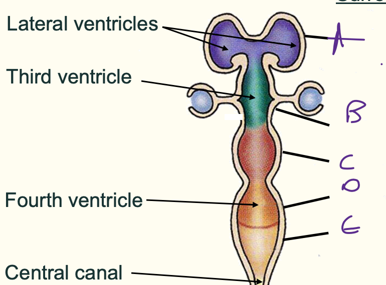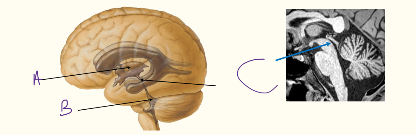 A = arachnoid granulation B = superior saggital sinus C = cerebellum/cerebral hemispheres D = cisterna magna