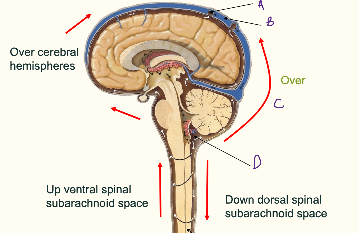 - flows over the cerebellum/cerebral hemispheres