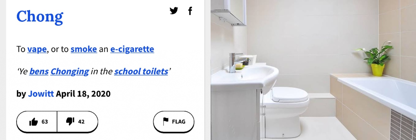 Think super clean bathroom and Ben deeply inhaling a vape (chonging) up the the bathroom so it is hard to see