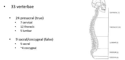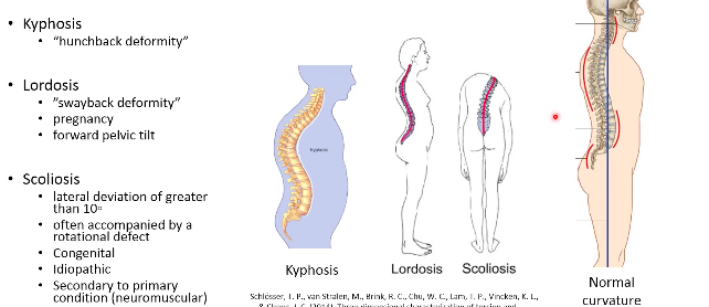primary curves (concave anteriorly) = thoracic + sacral/coccygeal (first to form in embryo)