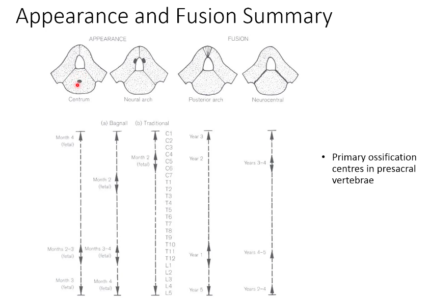 1st year of life - neural arches fuse posteriorly at the spinous processes (at the posterior synchondrosis)