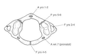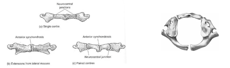 incomplete ring up until about 2 years as anterior arch takes longer to form than neural arches