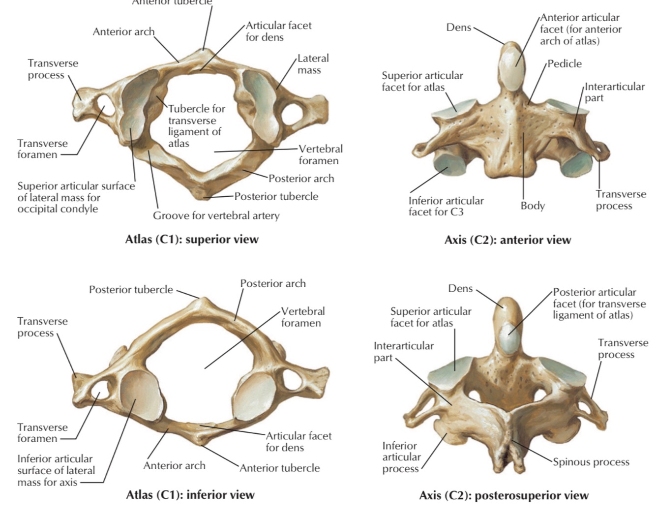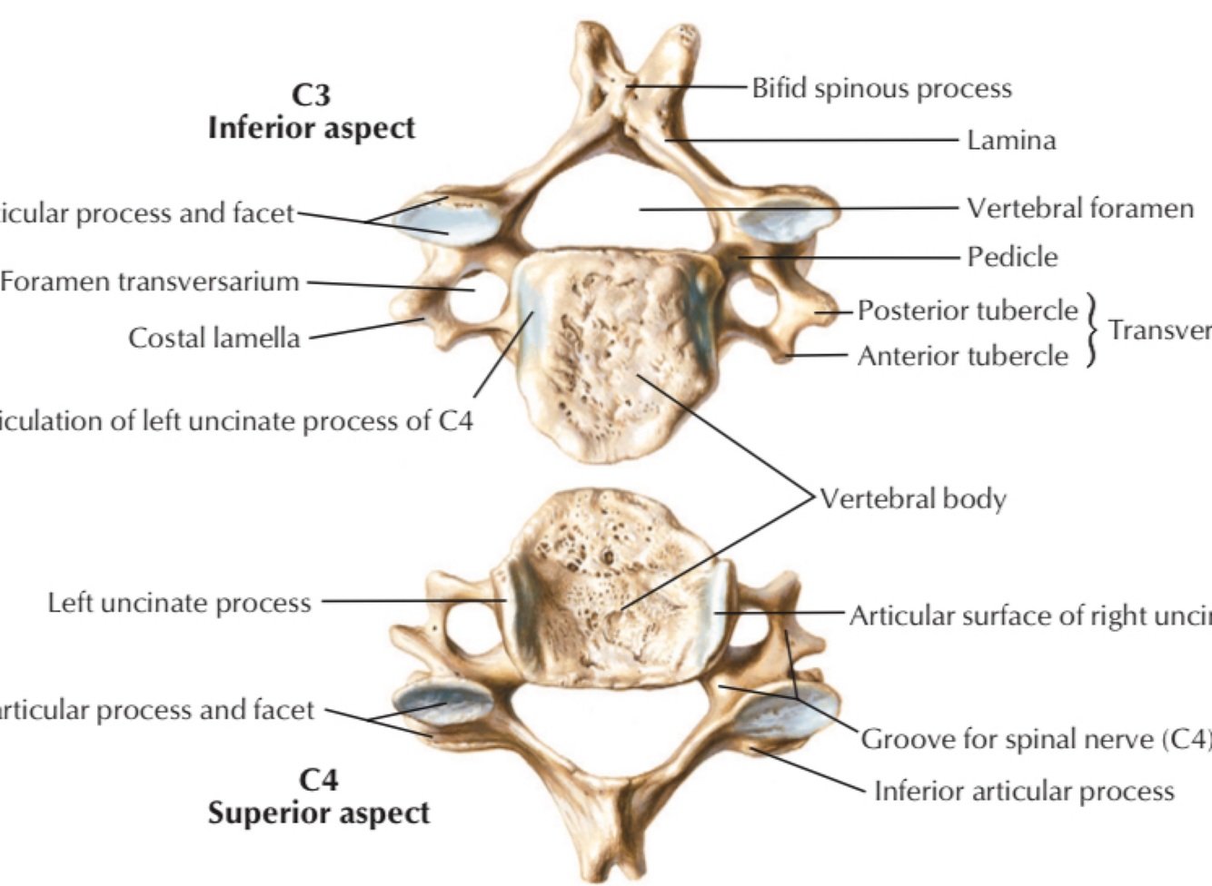 Transverse foramen in the transverse processes (ant and post tubercles)
