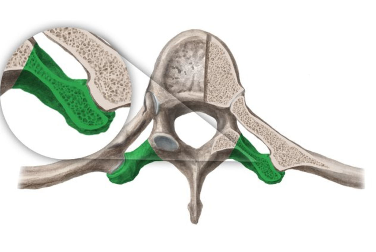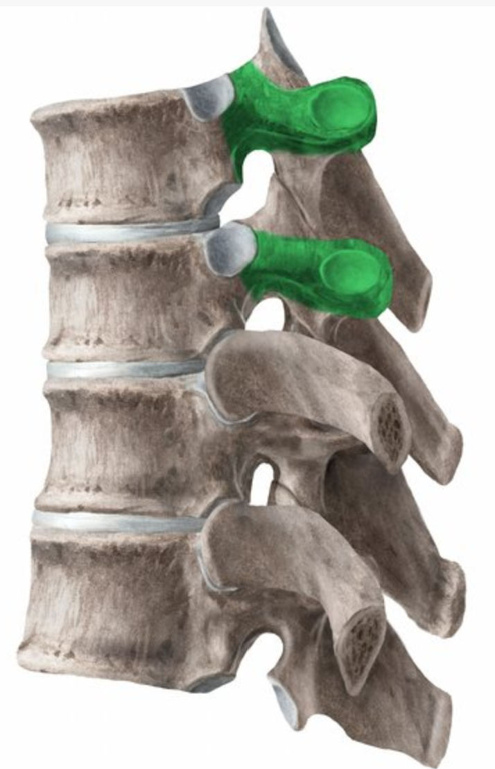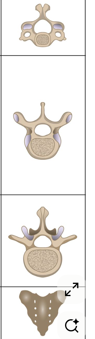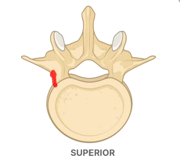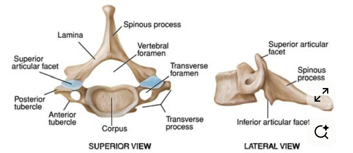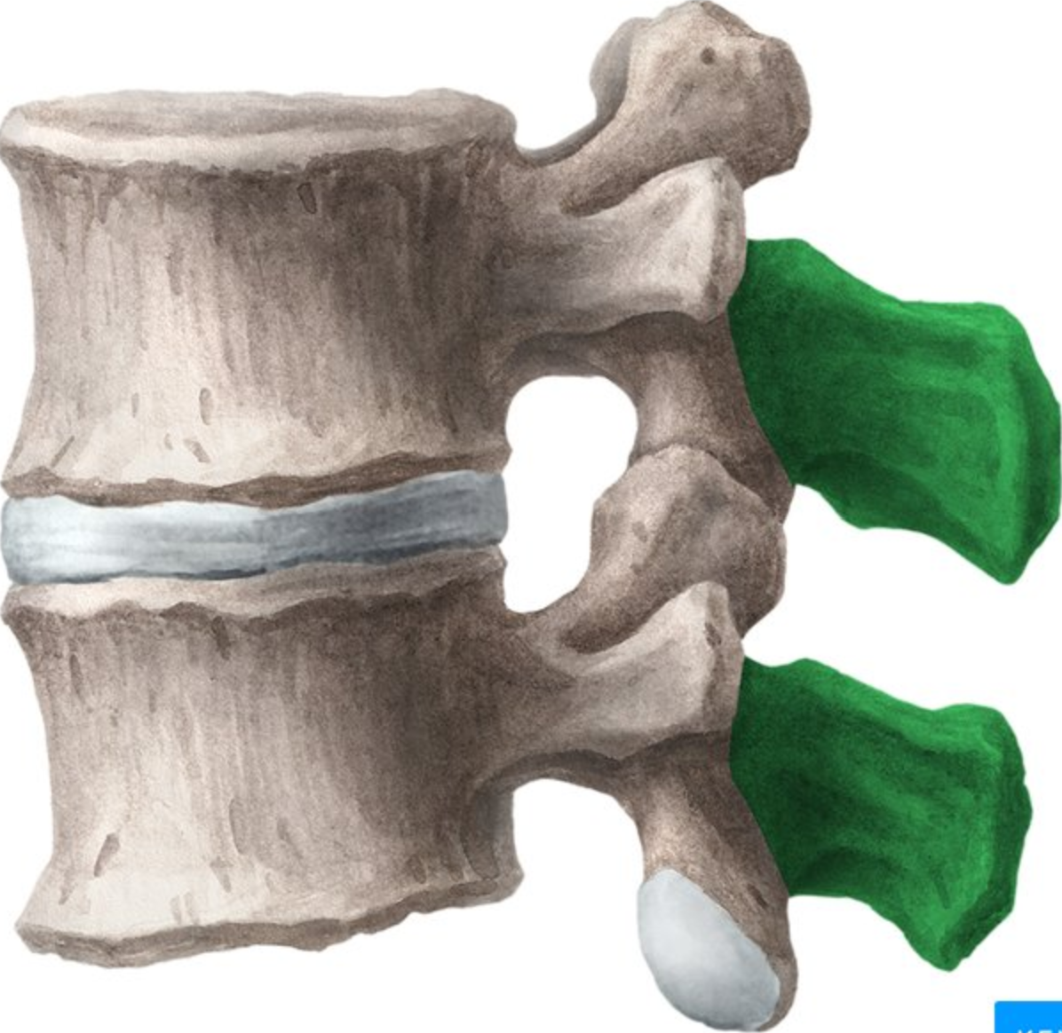 The characteristics of vertebrae (except C1 & C2 ) include 5 parts. List them and ID them on the image included.