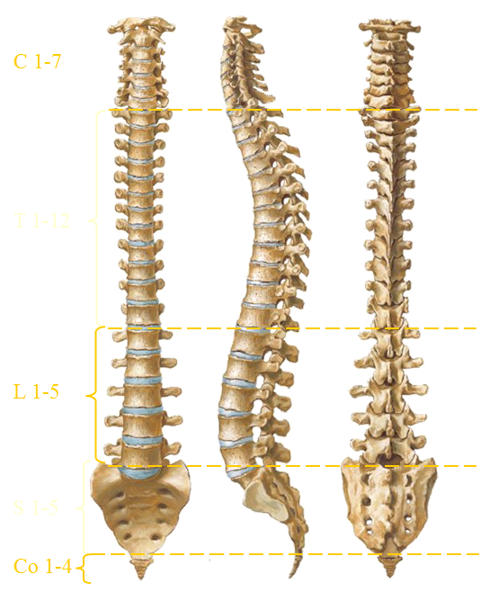 7 Cervical vertebrae, 12 thoracic vertebrae, 5 lumbar vertebrae, 5 sacral vertebrae, variable coccygeal vertebrae (typically 4)