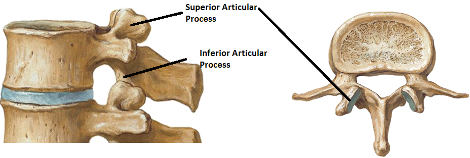 4 per vertebra, 2 superior (pre-zygapophyses) and 2 inferior (post-zygapophoses). Act to link vertebrae adjacent together. Spring from junction of pedicles and lamina. superior processes or prezygapophysis project upward from a lower vertebra, and their articular surfaces are directed more or less backward. inferior processes or postzygapophysis project downward from a higher vertebra, and their articular surfaces are directed more or less forward and outward
