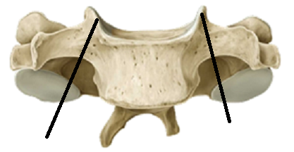 C1. Articulating surfaces for articulation with the occipital condyles (superior articulating surfaces) and Axis (Inferior articulating surface). LACKS A VERTEBRAL BODY; instead has an anterior and posterior arch (appears as a ring). Groove for vertebral artery on superior surface