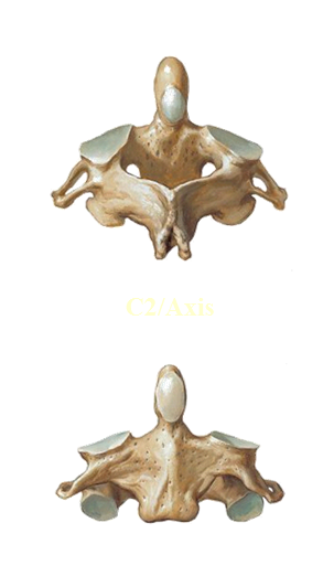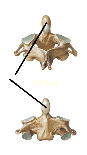 C2. Superior articulating surface (articulation with C1). Dens/odontoid process: former body of C1, allows pivoting for skull