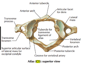 Its structure is special as C1 has no vertebral body or spinous process but is formed of only an arch and transverse processes,