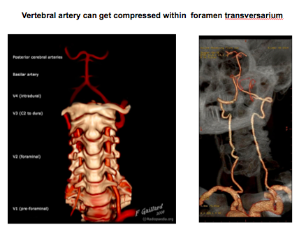 Compression of the foramen transversarium can lead to compression of the vertebral arteries leading to defecit of blood supply to the brain producing stroke like symptoms.