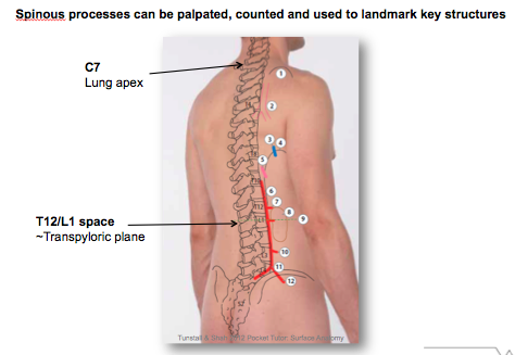Spinous processes can be palpated and used to count vertebrae to find key structures: