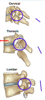 What happens to the zygaphyseal joints in different regions of the spine?