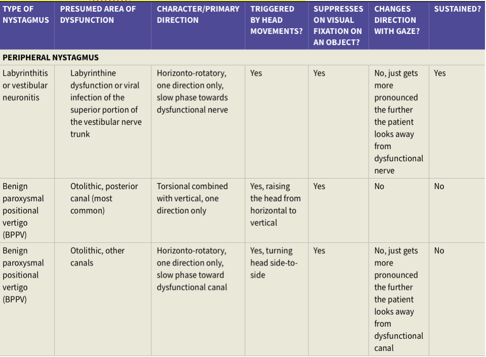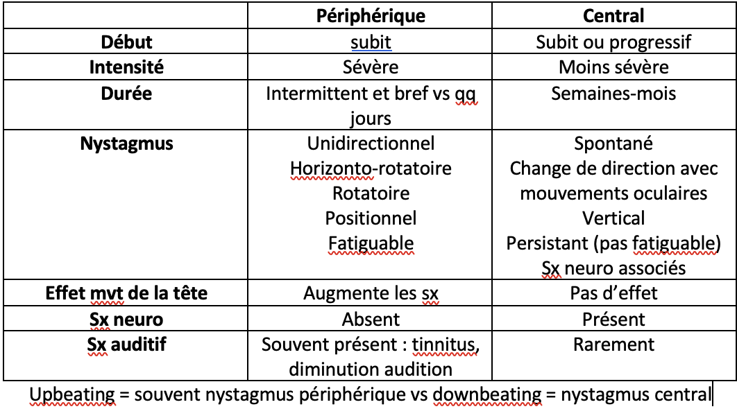 Comment distingue-t-on un nystagmus d’origine centrale vs périphérique?