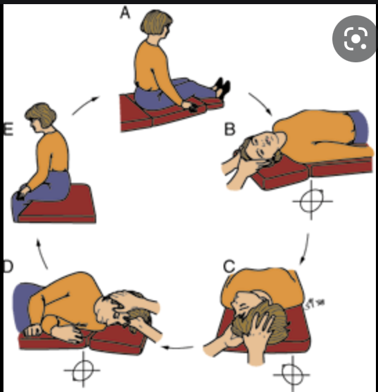 Epley: patient allongé, tête à 45°: commencer du côté de l’oreille symptômatique -> rotation de la tête de l’autre côté à 45° -> décubitus latéral avec tête maintenu en rotation p/r axe du corps -> retour position assise