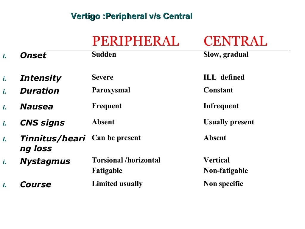 Peripheral vertigo (85%) is the result of a problem with your inner ear or CN VIII, which controls balance. Central vertigo refers to problems within your brain or brainstem.