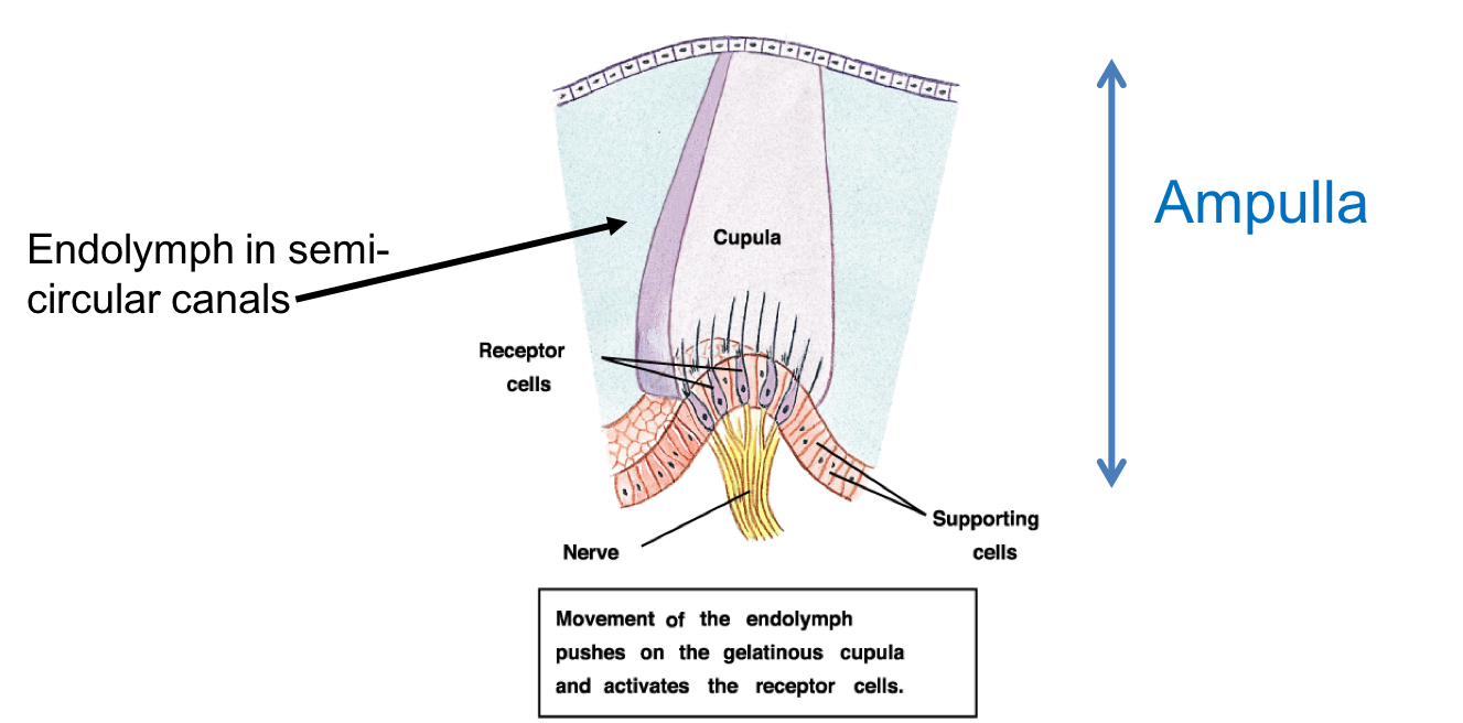 The hair cells are embedded in a flexible gelatinous structure called the cupula that stretches across the entire width of the ampulla and which becomes distorted by movement of the endolymph fluid within the canals