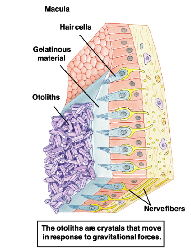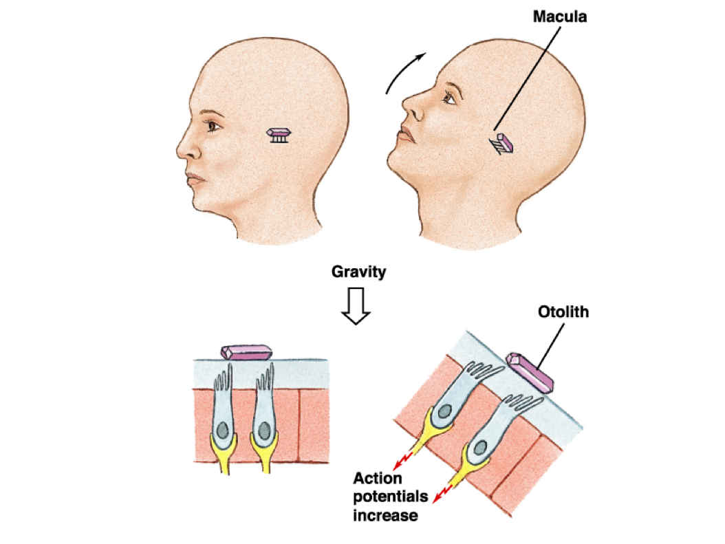 Tilt of the head is detected by the macula in the utricle (horizontal plane); otoliths have a density greater than endolymph and thus are affected more by gravity. Tilting the head moves the otoliths and the otolith membrane in which they are embedded. This distorts the jelly, and moves the cilia