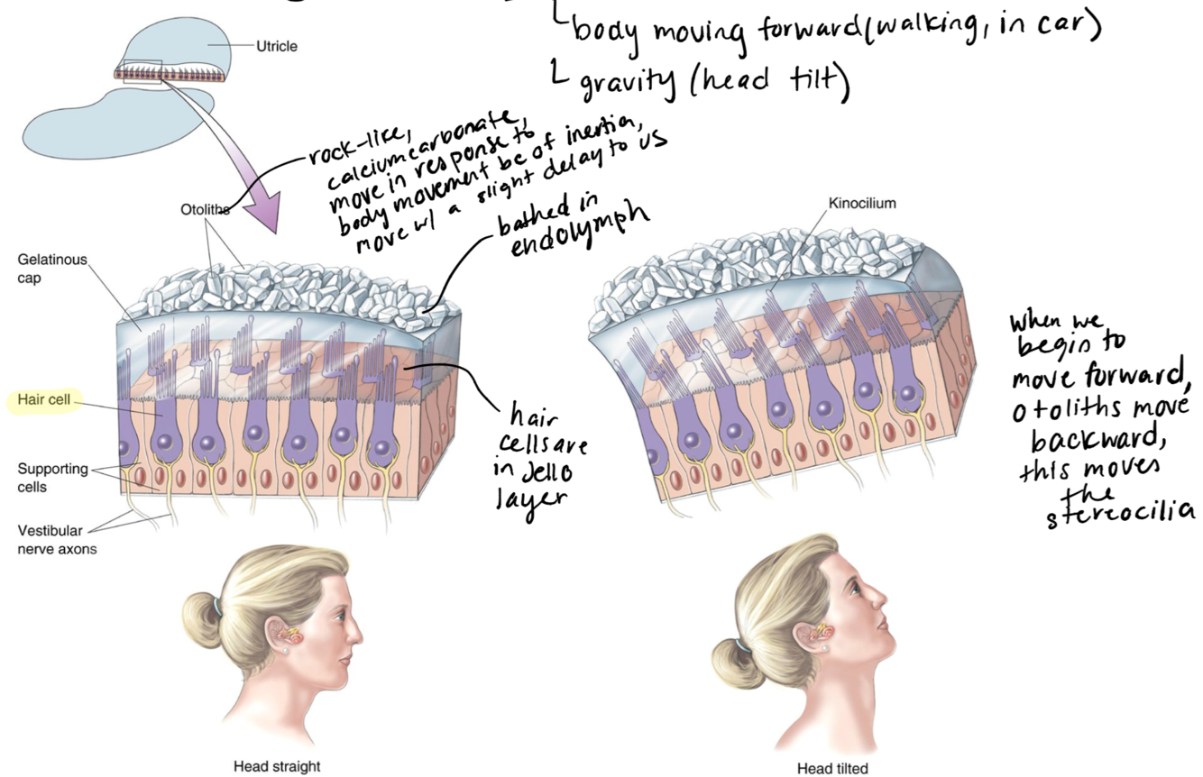 detecting linear acceleration (body moving forward and head tilt), otolith (small calcium carbonate rock like structures bathed in endolymph) move in the opposite direction of body movement because of inertia with slight delay