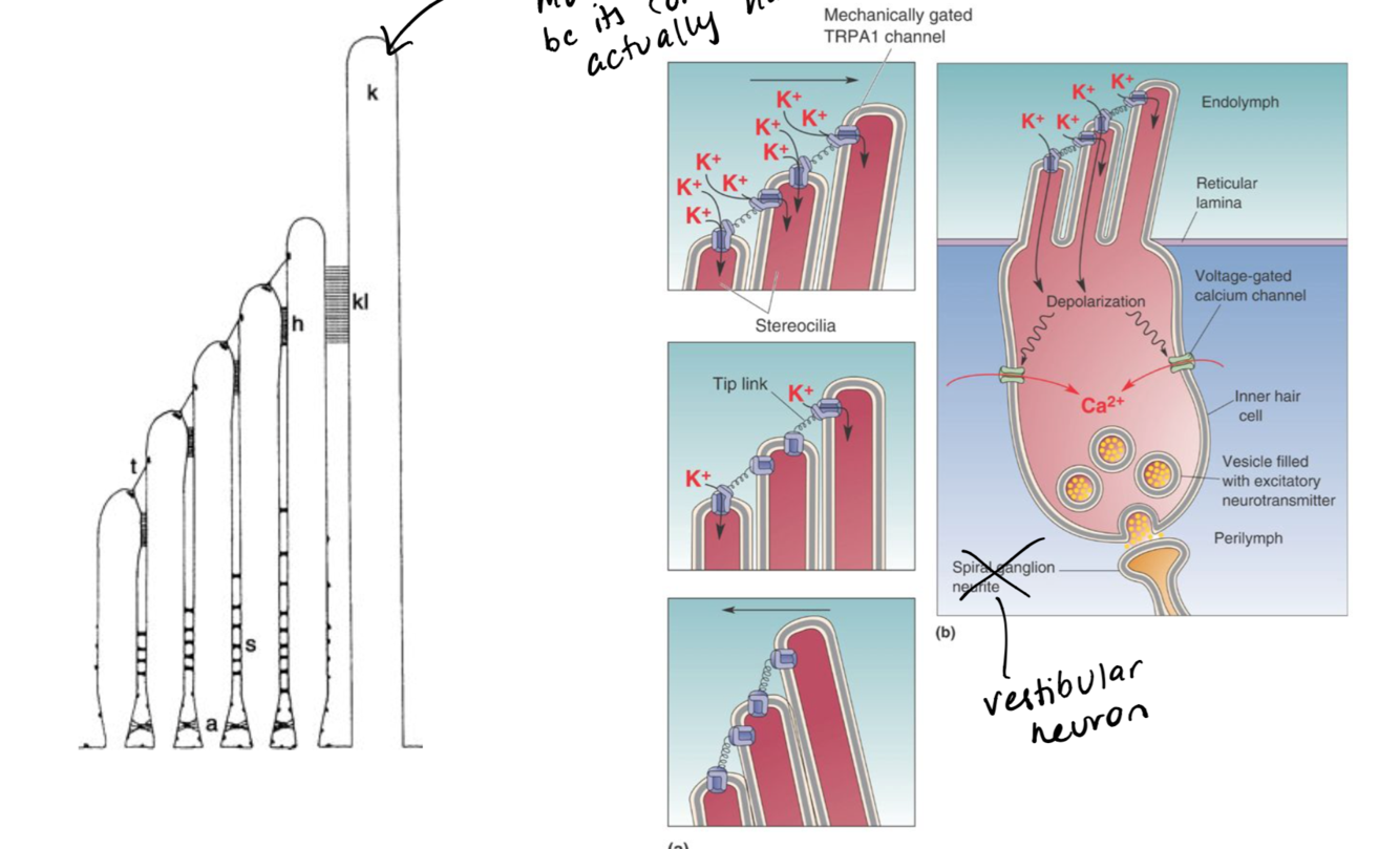 same as auditory system, kinocilium: larger than stereocilia and does not have a channel, helps to move all of the other stereocilia more