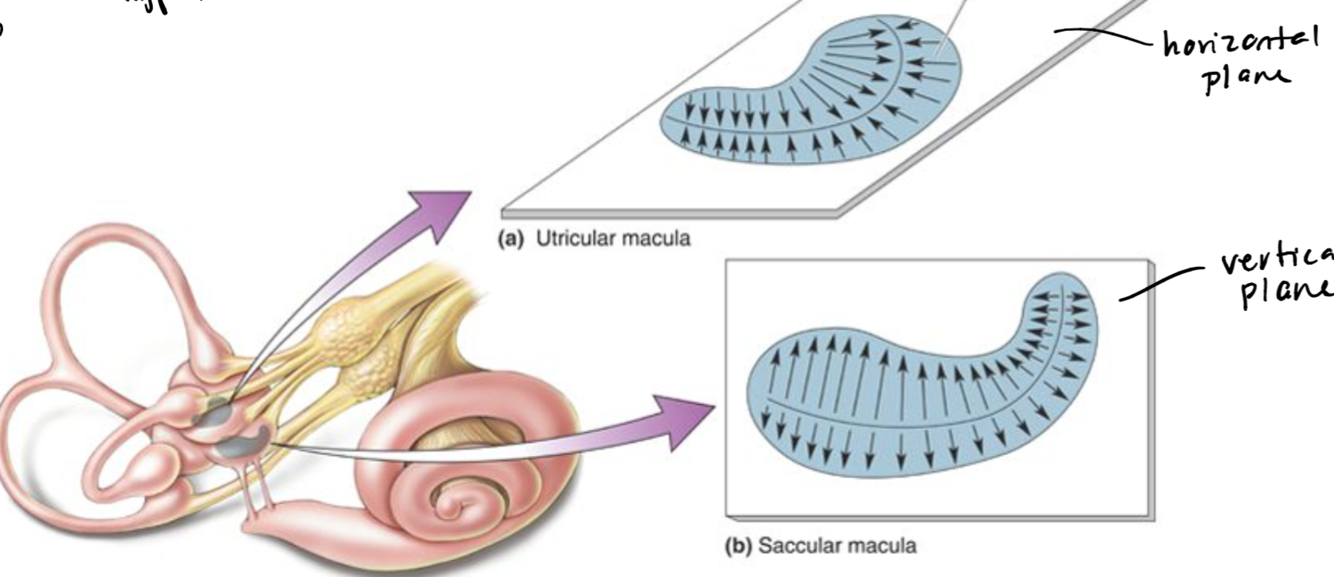 vertical: saccular macula, horizontal: utricular macula, directions for depolarization vary