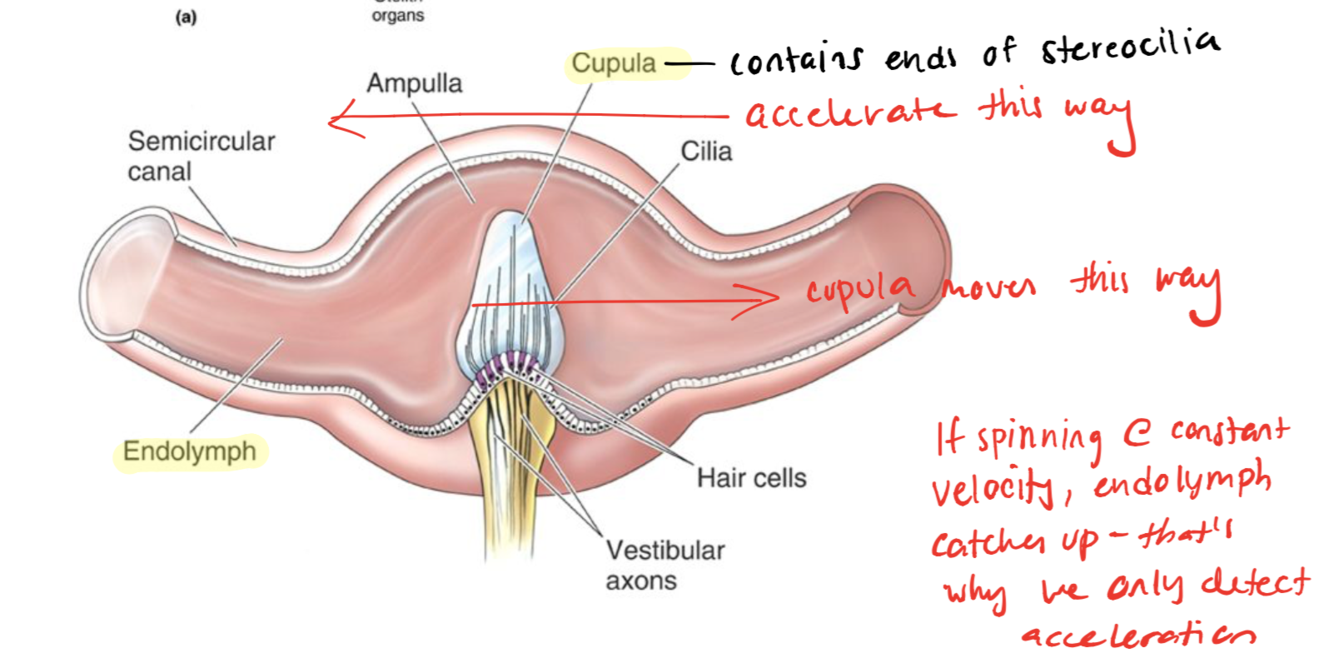semicircular canals detect spinning (turning head or body), cupula contains stereocilia and moves in response to angular movement of body, get opposite reactions from the semicircular canals on either side of the head, decrease response as endolymph catches up and hyperpolarization when we stop because cupula is pushed in the opposite direction