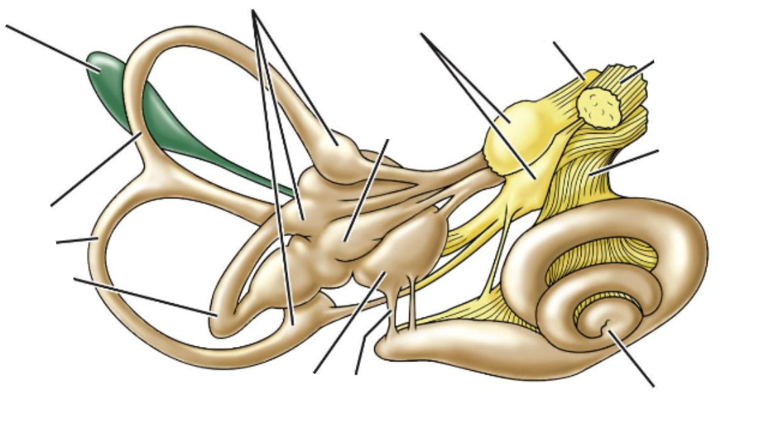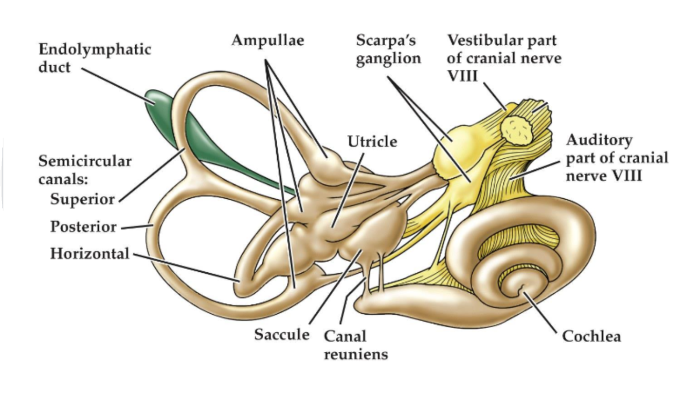 three semicircular ducts (horizontal, anterior and posterior), two otolith organs (saccule and utricle), and the cochlea