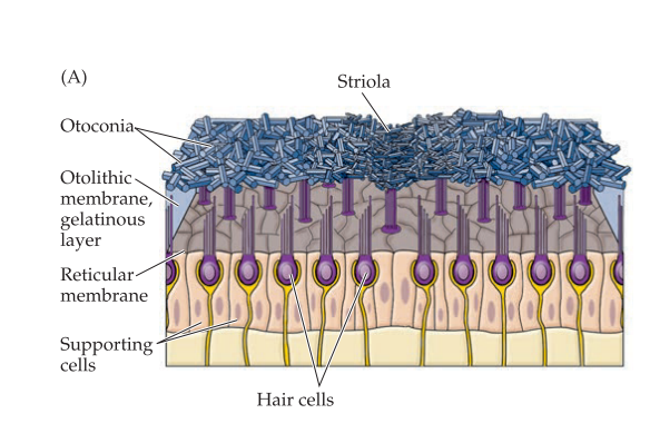Receptive organ with hair cells protruding into a flat gelatin matrix studded with otoliths.