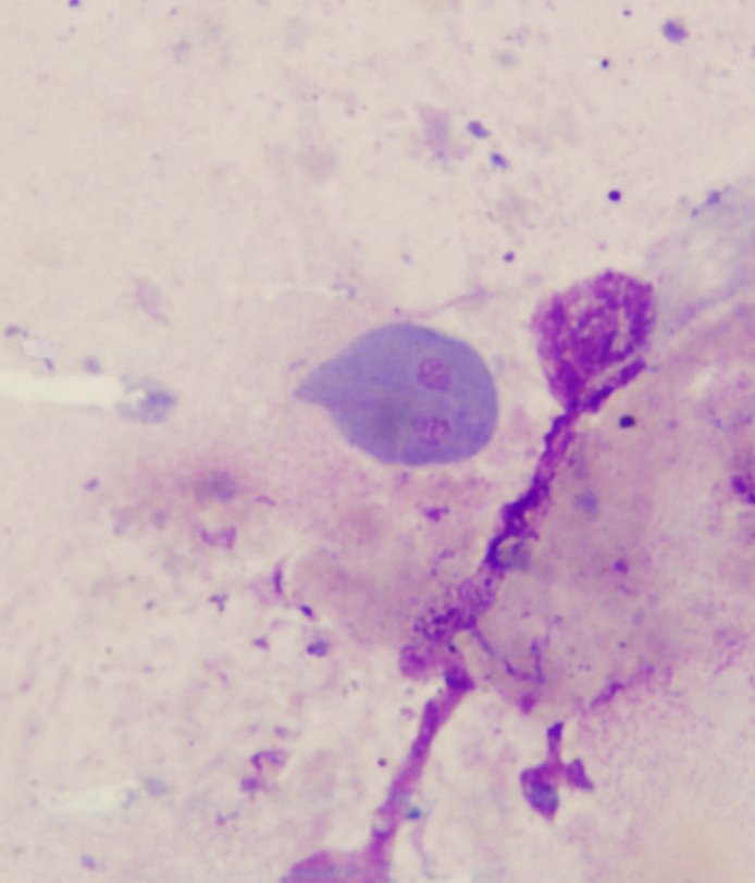 When sampling for cytology, frequently the first indication that a lipoma has been aspirated is the clear, oily appearance of the material ejected from the aspiration needle onto the slide. Care must be taken while staining to ensure that the material does not wash off the slide, as fat does not adhere readily to the glass surface.
