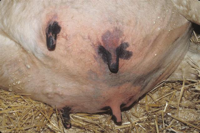 You examine a very ill 4-year old Holstein dairy cow on a large commercial dairy. She freshened one week ago and was producing well, until she was found down and unwilling to rise this morning when you were called. T=103F or 39.4 C, HR=90, and RR=35. The scleral vessels are dark are enlarged, her rumen is fairly empty and the motility is poor, and she appears too weak to rise. Rectal exam reveals an involuting uterus which can be retracted, discharging a brownish red mucoid non-odorous lochia through the vagina. The left rear quarter of her udder is swollen, hot, painful, and discolored (see image), and contains a serum-like secretion with clumps of fibrin in it. What is your diagnosis?