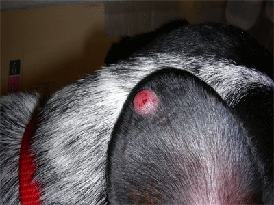 Histiocytomas are typically benign and will often present as a small, raised mass that may or may not be ulcerated. Fortunately, these masses usually regress on their own, and surgical or medical intervention is typically not necessary.