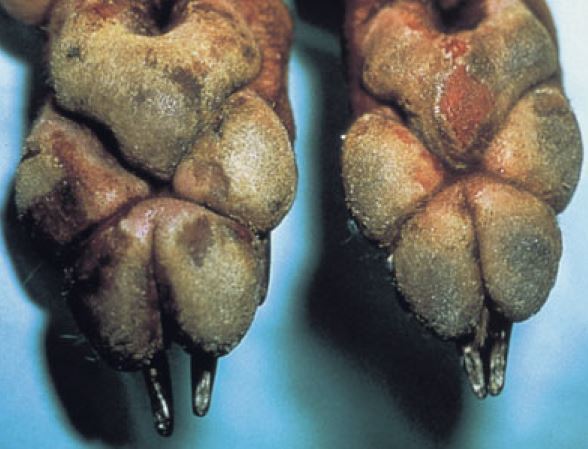 Hookworms can be transmitted in utero, during nursing, or via 3rd stage larva penetrating the skin. The most commonly affected skin areas are the pads and interdigital spaces of the feet, but can include any surface that contacts the ground. The larva migrate through the dog’s tissues before arriving in the intestines. They cause significant anemia, failure to thrive, or sudden death in young dogs. In mild cases, deworming protocols are often enough; with severe cases blood transfusions and parenteral treatments are often necessary.