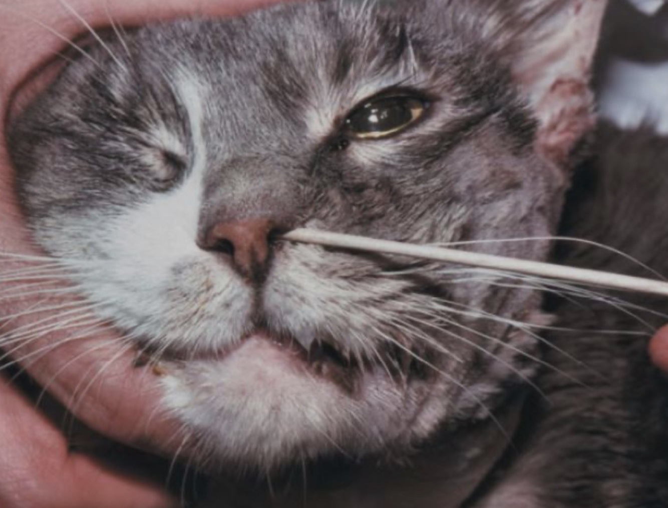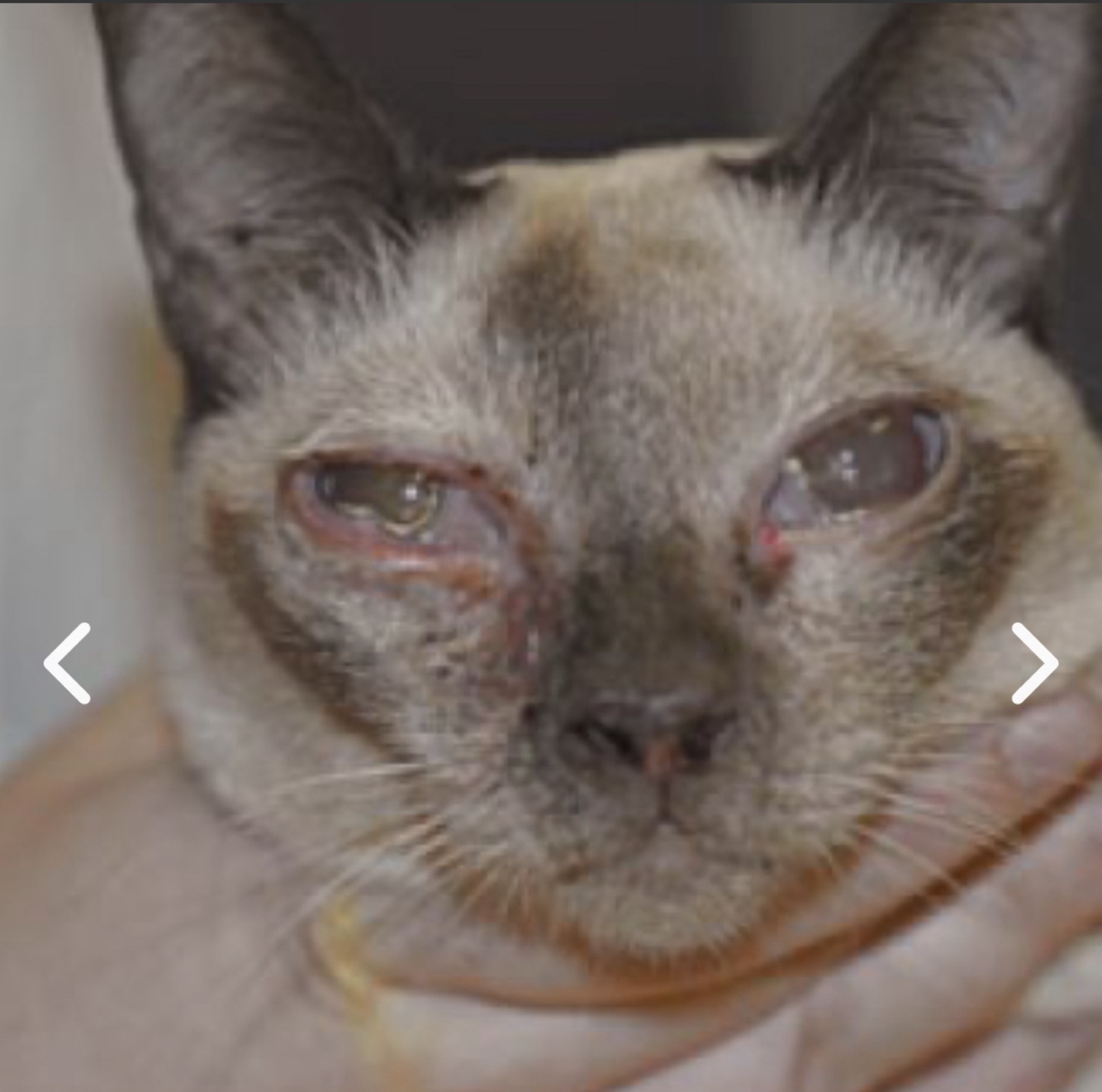 Frequently, feline patients with these symptoms are infected with both of these diseases simultaneously. Diagnosis of Chlamydophila felis is made by visualizing typical elementary bodies in the cytoplasm of conjunctival epithelial cells or obtaining a positive fluorescent antibody (FA) test on a conjunctival scraping. The treatment of Chlamydophila felis is topical tetracycline QID for one week post resolution of clinical signs.